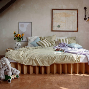 Our corrugated cardboard furniture embodies not only lightweight design but also ecological sustainability. Utilizing our specialized AVANA corrugated cardboard, which contains 54 to 80% recycled materials and is fully recyclable, reinforces our commitment to sustainability. We employ vegan corn starch-based adhesives and water-based, solvent-free inks. At the end of its lifecycle, simply dispose of the family bed in the paper recycling bin to reintegrate it into the recycling loop.